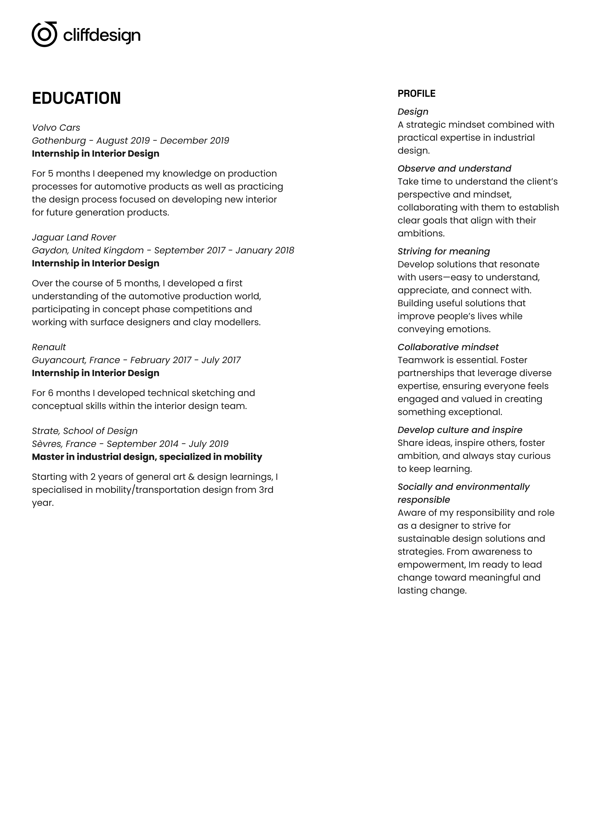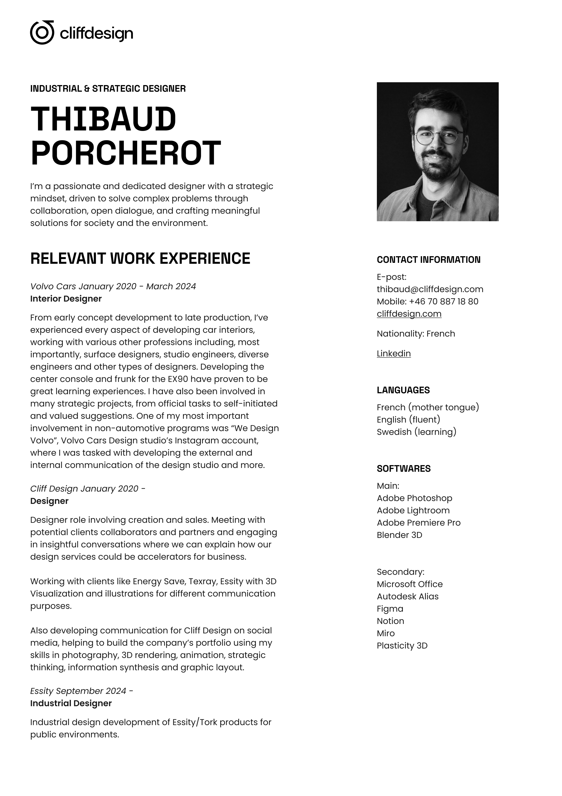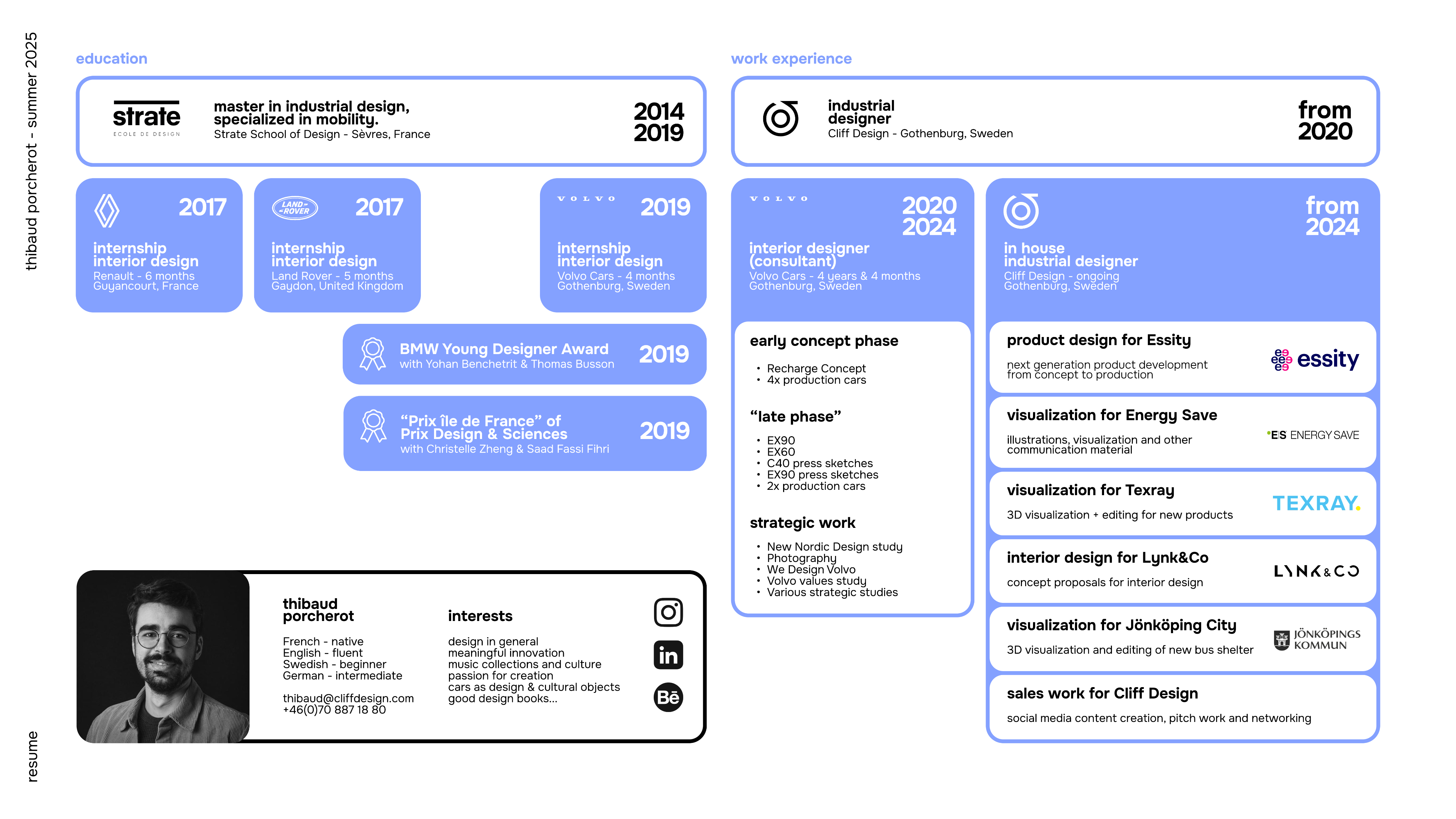 After 5 years working for Volvo Cars as an interior designer, I joined Cliff Design in 2024, an independent studio working across a wide range of industries. I’m there to collaborate with other passionate individuals, combining our competences and personalities to create great products and experiences that last. Want in?