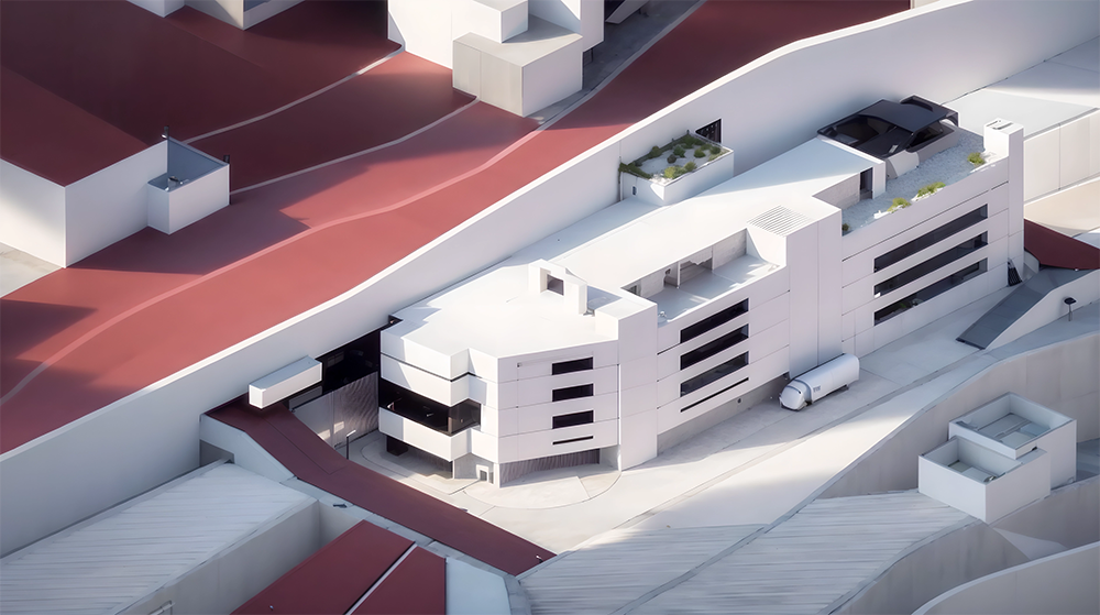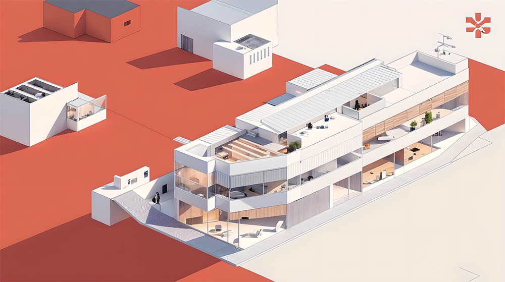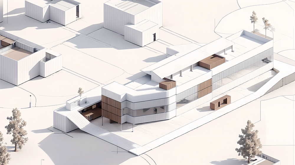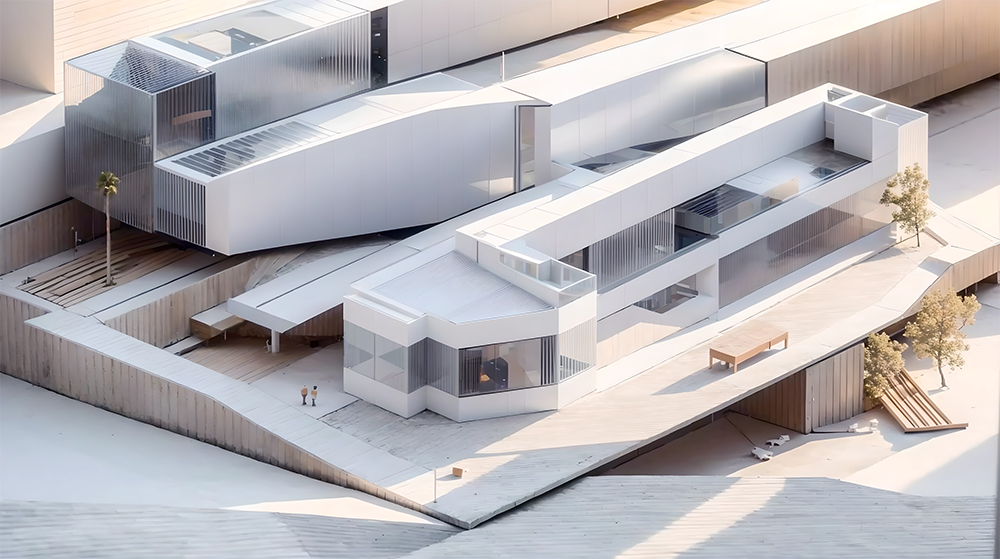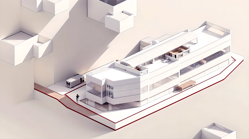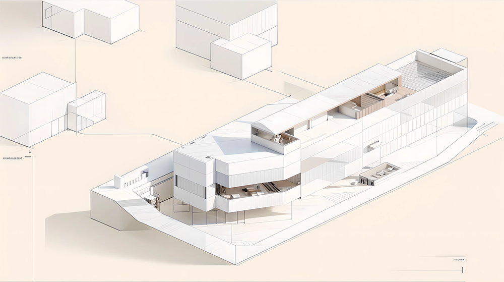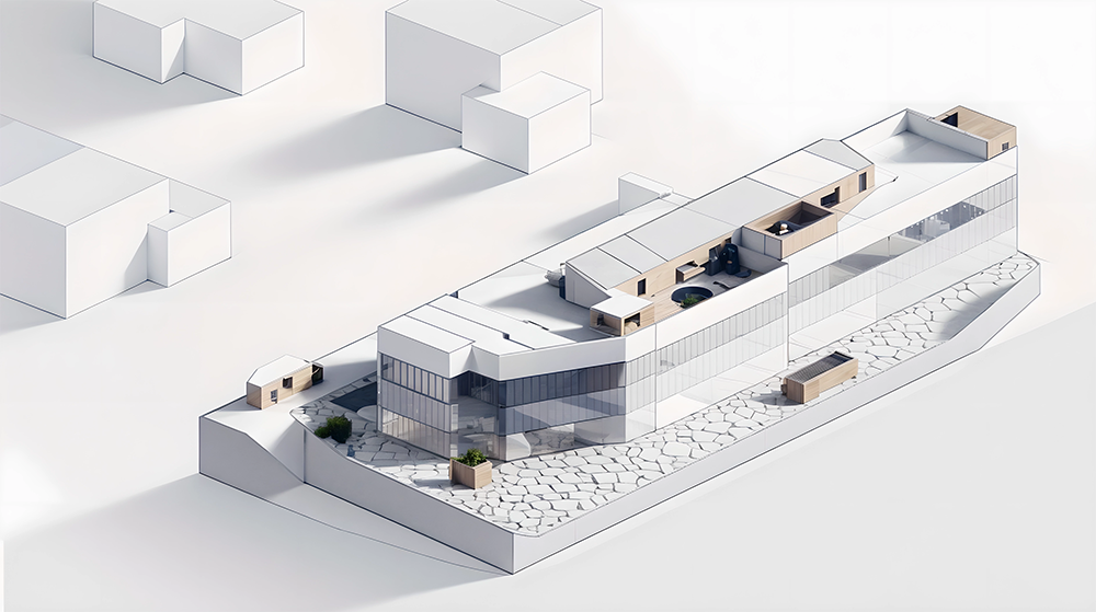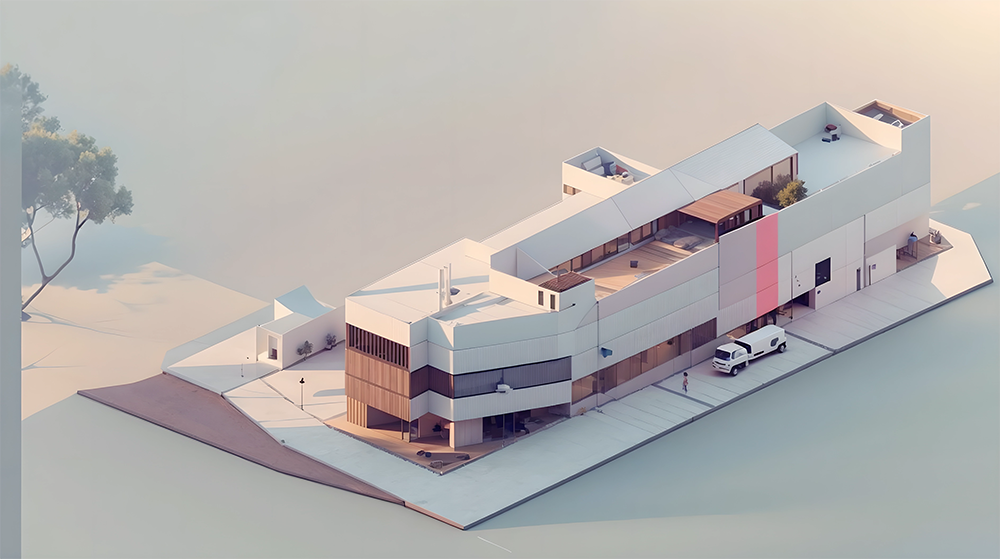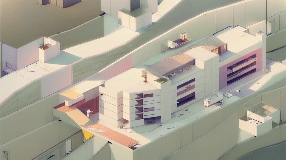 Using a base rendering of a 3D model we quickly developed (to ensure architectural accuracy), we generated a broad set of stylistic variations with the help of AI. This allowed us to rapidly explore multiple directions and visual moods, which would take much longer in a normal process.
