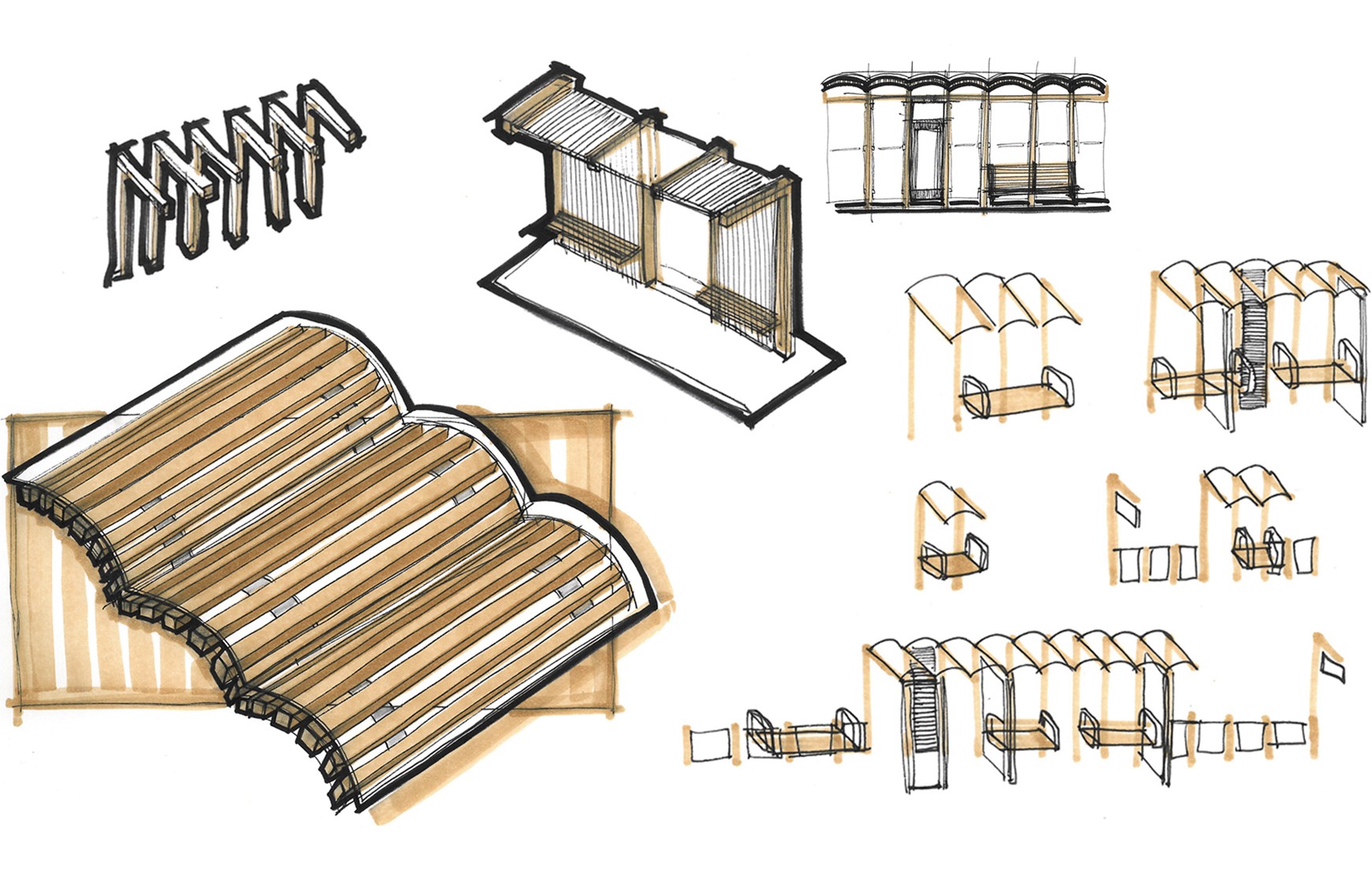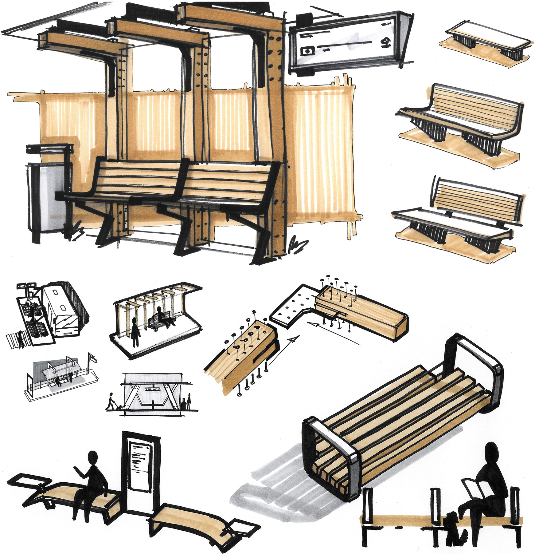 From early sketches inspired by insightful conversations with collaborators and users, to visuals highlighting the bus shelter’s key features, we used a range of graphic techniques to communicate our mindset and design process to the audience.